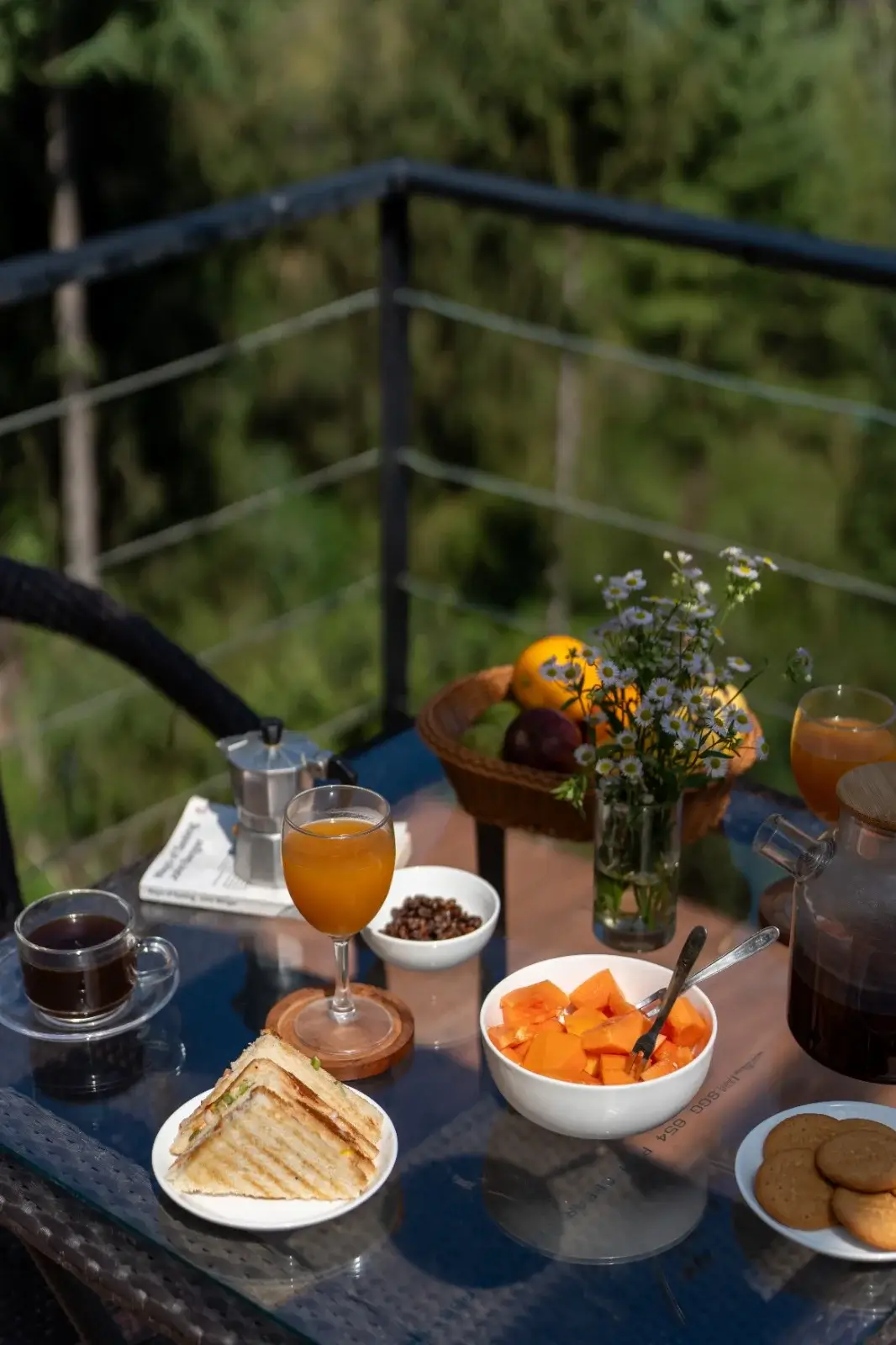 A short stroll away, our café & Mountain Deck welcomes you with soulful music, slow-cooked local and continental dishes, and fresh brews served with sweeping valley views. Every meal here is an experience shaped by the elements—sun, mist, snow, and starlight—turning simple moments into lasting memories.